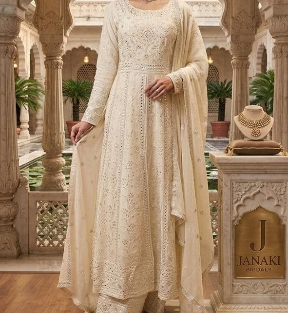 Elegant Ivory Chiffon Maxi Dress with Embroidered Detailing & Dupatta